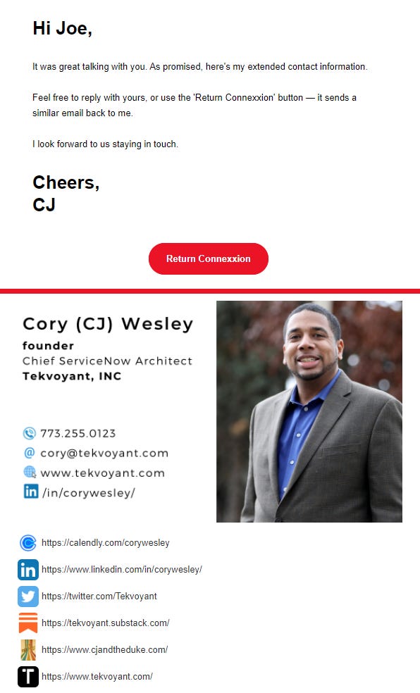Once you submit, a custom email gets sent to your new Connexxion, with all of your ‘enhanced’ contact details like podcasts, newsletters, LinkedIn, etc: